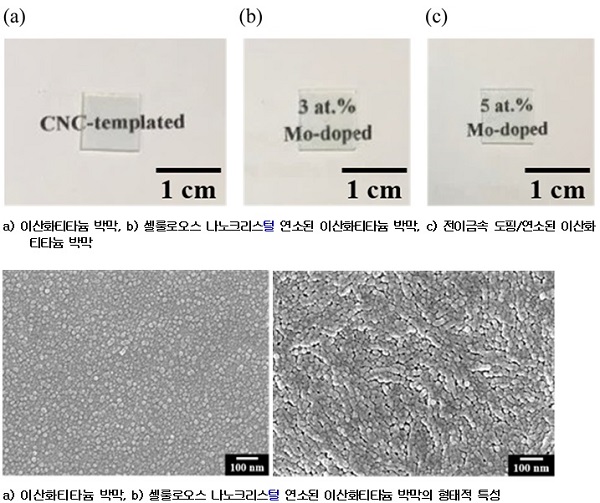 연구팀은 셀룰로오스 나노크리스털의 구조를 이용해 전이금속이 코팅된 이산화티타니아 박막의 물리화학적 특성과 오염물질에 대한 광분해 특성 평가를 무처리 박막 필름과 비교·분석했다.