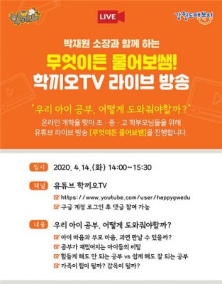 [충청뉴스큐] 강원도교육청은 오는 14일 오후 2시부터 3시 30분까지 강원도교육청 유튜브 채널 학끼오TV를 통해 초·중·고 학부모 대상의 ‘무엇이든 물어보쌤’ 온라인 라이브 방송을 진행한다.
