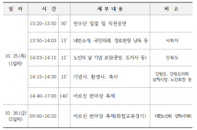 [충청뉴스큐] 제22회 노인의 날을 맞아, 나라와 사회발전을 위해 헌신해 오신 어르신들의 노고에 감사드리고 어르신들의 사기를 북돋우기 위하여, 오는 25일부터 26일 이틀간, 삼척시종합운동장에서 “제22회 노인의 날 기념식 및 제10회 강원어르신한마당축제”를 개최한다.