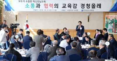 [충청뉴스큐] 전남도교육청은 지난 10월 31일 영암군 삼호읍 소재 호텔 현대에서 사립학교 이사장 57명을 대상으로 ‘교육감 경청올레’를 실시했다. 이번 ‘경청올레’는 공정성과 투명성을 강화해 신뢰받고 존중받는 사학을 만들기 위한 소통과 협력 기회로 마련됐다.