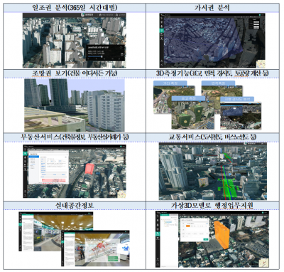 3D 지도는 인터넷으로 접속하여 대구 전지역을 입체적으로 살펴볼 수 있고, 시간과 계절에 따른 일조권, 조망권 등의 경관분석과 표고·면적·경사도 등의 측정이 가능하다.