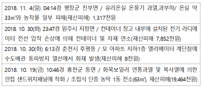 난방기기 화재중에서는 화목보일러 화재가 18건으로 가장 많고, 나무·목탄 난로 화재 15건, 열선화재 10건, 전기히터·스토브 화재 7건, 가정용 보일러화재 6건, 기타 전기장판 및 석유난로 화재 6건 등이었다.