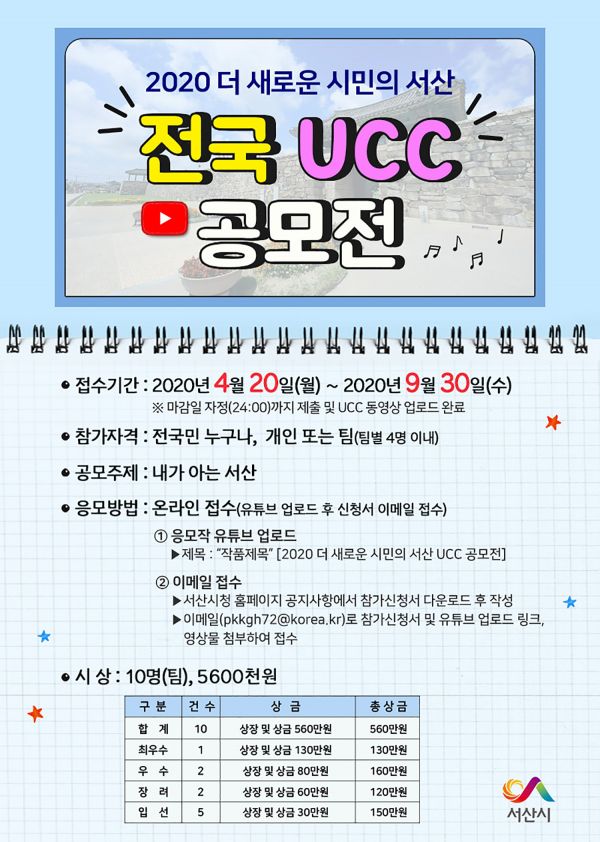 [충청뉴스큐] 서산시가 오는 30일까지 ‘2020 더 새로운 시민의 서산, 전국 UCC 공모전’을 접수한다.
