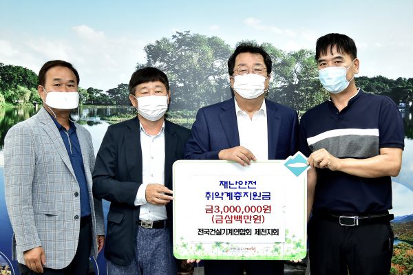 [충청뉴스큐] 전국건설기계연합회 제천지회가 지난 8일 제천시청 시장실을 찾아 이상천 제천시장에게 재난안전취약계층 지원금 3백만원을 전달했다.