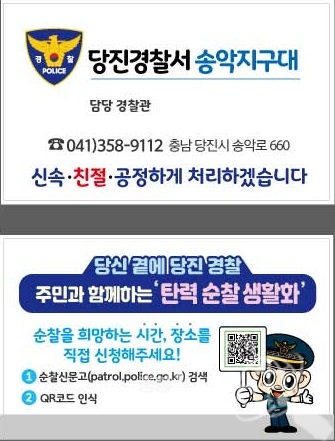 당진경찰서 송악지구대(대장 김유태)는 신고사건 처리나 민원인 방문 시 배부하는 담당 경찰관의 이름, 연락처가 담긴 명함 뒷면을 활용하여 탄력순찰 신청방법에 대해 적극 홍보로 체감안전도 제고 및 만족도 향상에 노력하고 있다“고 전했다.