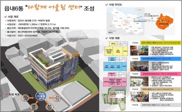 공모에 선정된 “다함께 어울림센터”는 지역내 부족한 생활SOC시설을 복합화한 시설로써 지하1층, 지상4층 연면적 2,711㎡규모로 신축되며 지하1층에는 주차장, 1층 지역소통방, 2층 공동육아나눔터, 3층 건강생활지원센터, 4층은 실버코워킹스페이스, 옥상에는 공동텃밭이 조성될 예정이다.