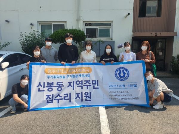 이날 봉사활동에는 청주대학교 산학협력단에서 200만원을 후원하고 청주대학교 사회복지학과 김현진 교수를 비롯해 직원 및 학생 9명이 참석해 도배·장판 시공, 청소 등 따뜻한 나눔 활동을 펼쳤다.