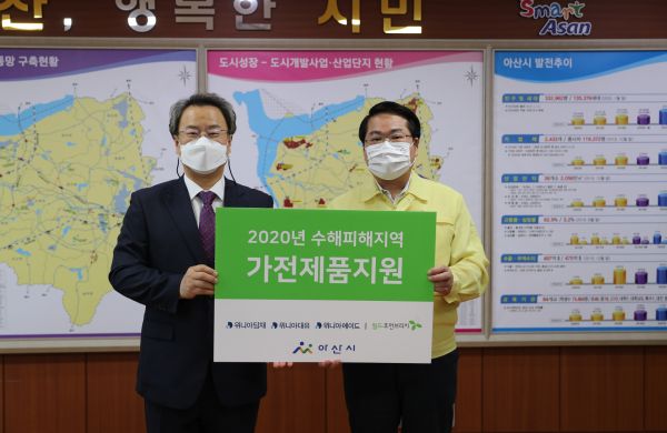 [충청뉴스큐] 월드휴먼브리지 아산지역본부가 17일 아산시를 방문해 집중호우로 피해를 입은 주민 및 저소득층 지원을 위해 700만원 상당 세탁기 14대를 전달했다.