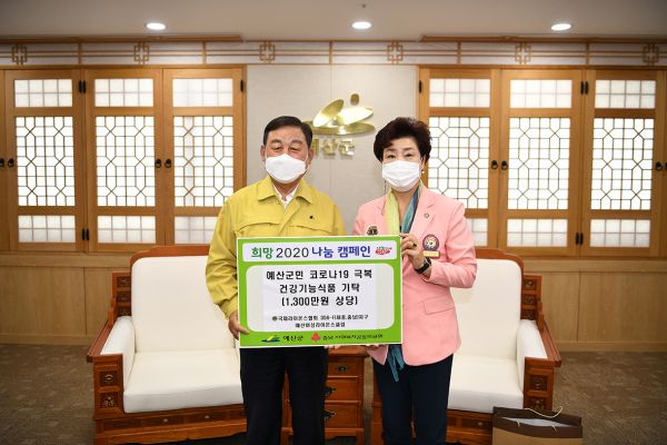 [충청뉴스큐] 예산군은 지난 17일 예산여성라이온스클럽으로부터 코로나19 극복을 위한 1300만원 상당의 건강기능식품을 기탁 받았다.