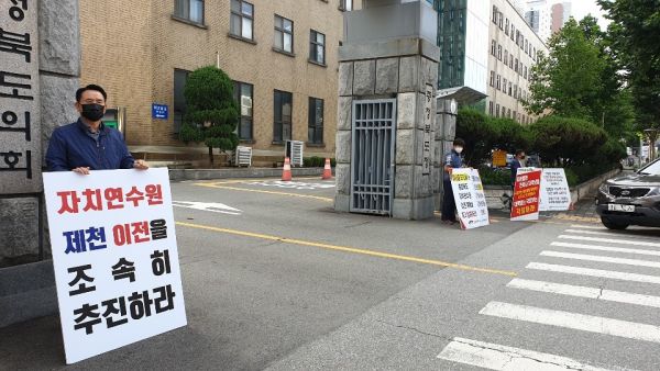 [충청뉴스큐] 제천시 새마을회는 지난 18일 충청북도청 앞에서 직원들이 출근하는 시간대에 맞춰 충청북도 자치연수원의 신속한 제천 이전을 촉구하는 1인 시위를 펼쳤다.