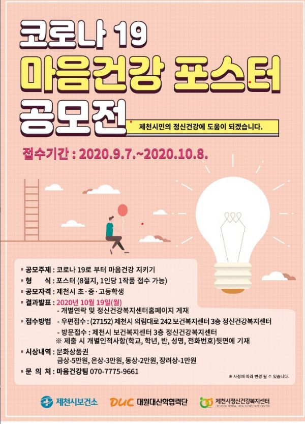 제천시에 거주하는 초·중·고등학교에 재학중인 청소년이라면 누구든 가능하며 코로나19로 불안, 스트레스 등 우울감이 나타나는 ‘코로나 블루’를 자신만의 마음건강을 지키는 방법에 대해 청소년 시선에서 서로 공유할수 있는 작품을 공모하면 된다.
