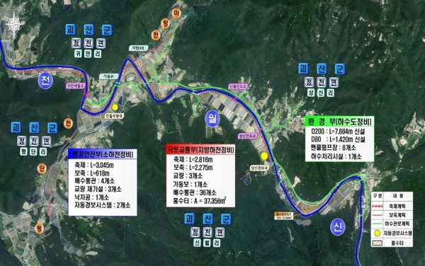 군은 이번 사업을 통해 청천면 귀만리에서 사담리까지 5.09km에 달하는 지방하천 신월천과 함께 마향소하천, 평단소하천에 이르는 3.66km 구간의 제방 및 호안시설을 보강하고 계획홍수위 및 여유고 미확보 교량 6개소를 재가설해 치수 안정성을 확보할 계획이라고 전했다.
