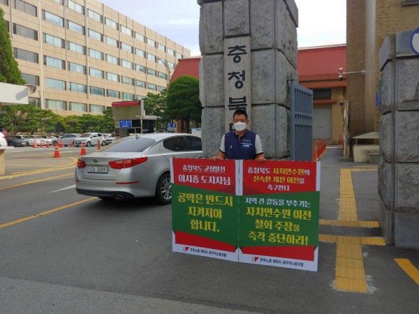 21일 1인 시위에 참여한 제천시공무직노동조합에서는 “이시종 도지사의 충청북도 균형발전 공약은 반드시 지켜져야 한다”며 “지역 간 갈등을 부추기는 자치연수원 이전 철회 주장을 즉각 중단하라”고 말했다.