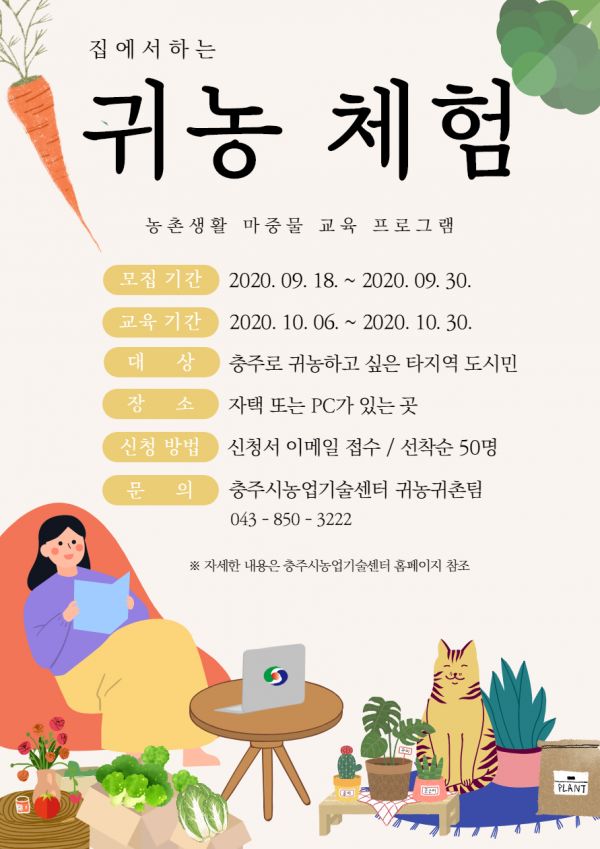 [충청뉴스큐] 충주시가 인구 유입을 위해 귀농·귀촌을 희망하는 충주 외 지역 도시민을 대상으로 SNS를 이용한 ‘집에서 하는 귀농체험’ 교육생을 모집한다고 22일 밝혔다.