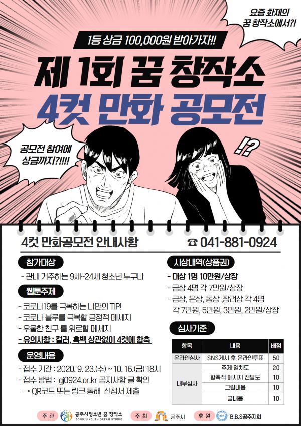4컷 만화 공모전은 코로나19를 이겨내기 위한 메시지를 4컷에 함축해 공주시청소년꿈창작소 홈페이지를 통해 제출하면 된다.