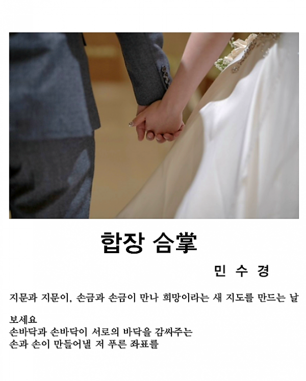 [충청뉴스큐] 한국 문단 최고의 디카시 등용문인 ‘오장환디카시신인문학상’에 민수경씨의 작품 ‘합장合掌’이 당선했다.