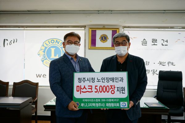 [충청뉴스큐] 국제라이온스협회356-D지구 1,2,3지역 재청협의회가 28일 청주시 노인장애인과에 생활이 어려운 장애인들에게 전달해 달라며 마스크 5000장을 기탁했다.