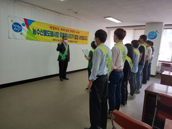 [충청뉴스큐] 청주시 도매시장관리과 직원들이 5일 청주시 농수산물도매시장 회의실에서 부정⋅부패 없는 전국에서 제일 청렴한 농수산물도매시장 만들기 직원청렴 결의 대회를 개최했다.