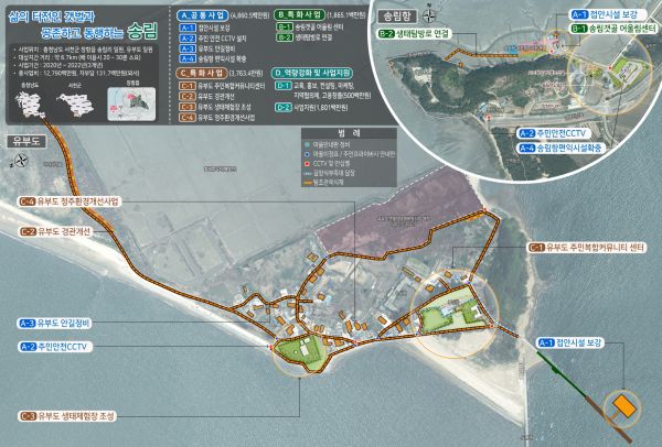 주요 사업내용으로는 송림항 및 유부도 접안시설 보강, 안길정비, 주민안전 CCTV 설치, 주차장 조성 등 4개 공통사업과 송림갯골어울림센터, 갯골사이로 조성, 유부도 주민복합커뮤니티센터, 정주환경 개선, 경관사업, 생태정원 등 6개 특화사업, 송림항과 유부도의 지속 가능한 발전을 위한 주민역량강화사업으로 구성됐다.