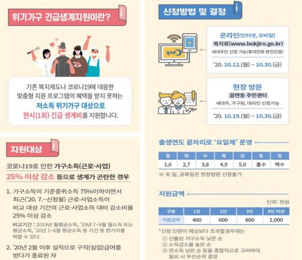 지급대상은 코로나19로 인한 실직, 휴·폐업 등 소득 감소로 생계가 어려워진 기준중위소득 75% 이하이면서 재산이 3억5,000만원 이하인 가구이며 한시 긴급 생계비를 지급한다.