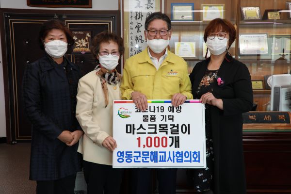 [충청뉴스큐] 영동군문해교사협회가 8일 영동군청에 1백만원 상당의 마스크걸이 1천개를 기탁했다.