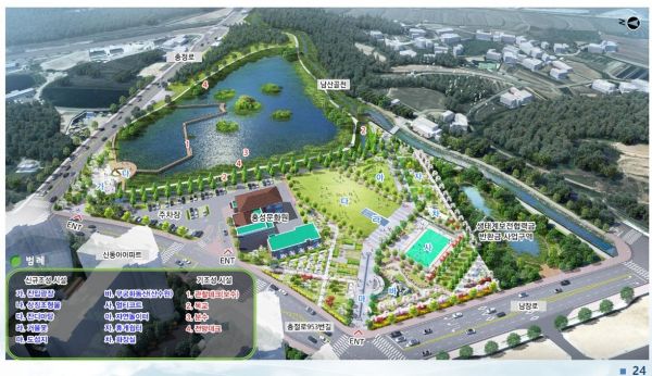 군은 저수지 주변 경작, 쓰레기 등 환경훼손으로 불안정한 상태로 방치되고 있던 이 곳에 기존 논 습지의 생태환경을 고려한 생물서식 습지, 양서류서식처, 야생초화원 등을 조성해 도심 내 수 생태계 네트워크를 구축할 방침이다.