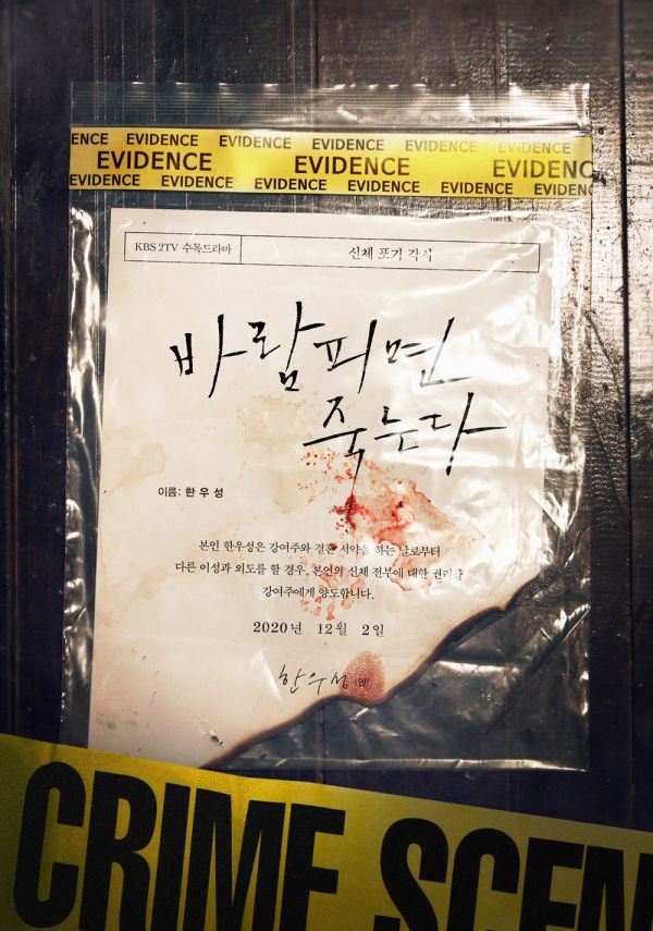 KBS 2TV 새 수목드라마 '바람피면 죽는다' 측은 오늘 사건 현장 증거물인 ‘신체 포기 각서’를 1차 티저 포스터로 공개했다.