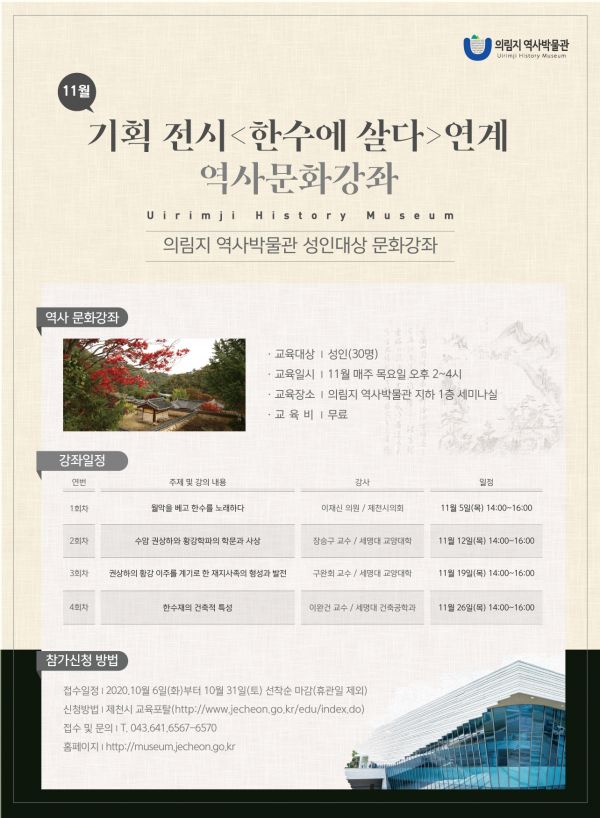 [충청뉴스큐] 제천 의림지 역사박물관은 오는 11월 성인대상 교육프로그램 제2회 역사문화강좌를 개최한다.