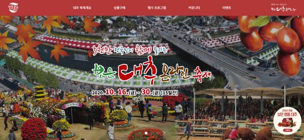 올해 보은대추축제는 코로나19 확산 방지를 위해 온라인으로 10월 16일부터 30일까지 15일간 개최됨에 따라 인터넷을 통한 축제 프로그램 및 대추 등 농·특산물 판매에 관심이 쏠리고 있다.