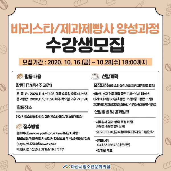 바리스타 양성과정 및 제과제빵사 양성과정은 총 4주 과정으로 11월 진행되며 아산시 거주·재학 중인 11게에서 19세 청소년을 대상으로 각 과정별 30명 정원으로 운영된다.