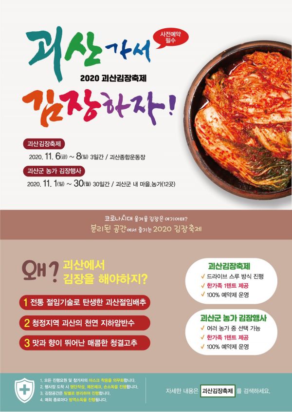 괴산군 관계자는 “철저한 준비를 통해 더욱 풍성하고 알찬 2020 괴산김장축제를 선보이겠다”고 말했다.