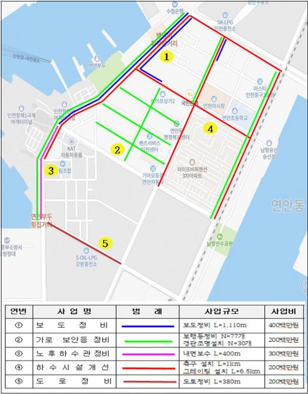우선, 연안초교 일원 어린이 통학로 환경개선 사업을 통해 노면표시, 안전표지, 옐로카펫, 과속경보시스템, 무인교통단속장비 설치를 할 예정이며 버스정류장도 25개소를 신설 및 보수하고 연안부두 진입도로 경관개선 사업도 더불어 추진할 예정이다.