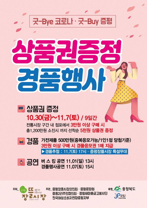[충청뉴스큐] 증평군이 오는 30일부터 다음달 7일까지 9일간 코로나 19로 침체된 전통시장을 살리기 위해 온누리 상품권 페이백 행사 ‘굿-Bye 코로나 굿-Buy 증평’을 실시한다.