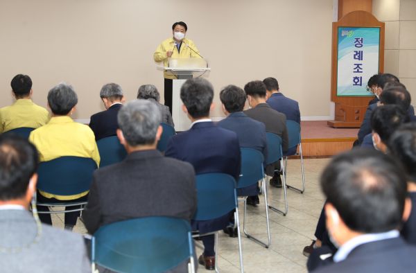 [충청뉴스큐] 한범덕 청주시장이 2일 시청 대회의실에서 직원 정례조회를 열어 올해 가장 중요한 것은 방역이라고 재차 강조했다.