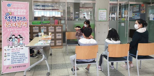 [충청뉴스큐] 청주시 청원도서관이 지난달 31일 방문하는 이용객을 대상으로 ‘청렴퀴즈 온더블럭행사’를 진행해 시민의 청렴인식을 새롭게 하는 시간을 마련했다.