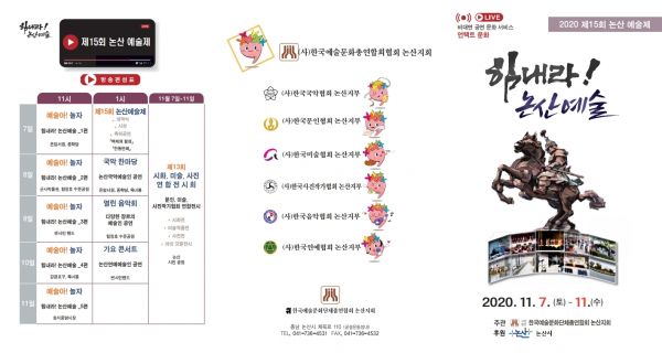 논산예술제는 논산시가 주최하고 한국예총 논산지회가 주관하는 행사로 올해는 코로나19 확산 방지를 위해 한국예총논산회 유튜브와 논산시민공원 일원에서 온택트 방송 및 오프라인으로 병행 실시된다.