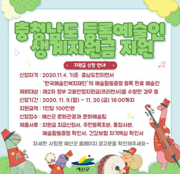 [충청뉴스큐] 예산군은 11월 9일부터 오는 11월 20일까지 ‘충청남도 등록예술인 생계지원금’ 신청 접수를 받는다.