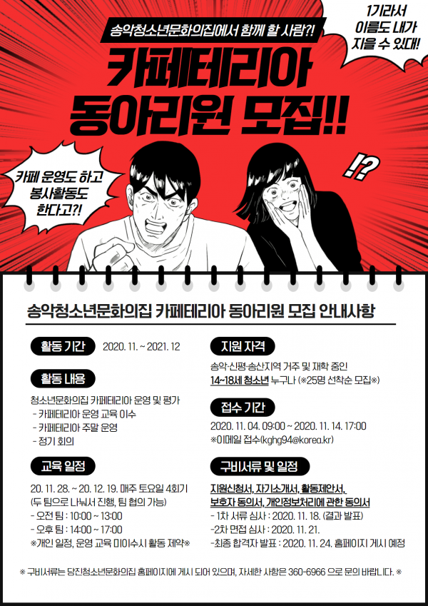 동아리원 지원자격은 송악·신평·송산에 거주하거나 재학 중인 14~18세 청소년으로 카페테리아 운영교육과 활동에 성실히 참여할 수 있어야 한다.