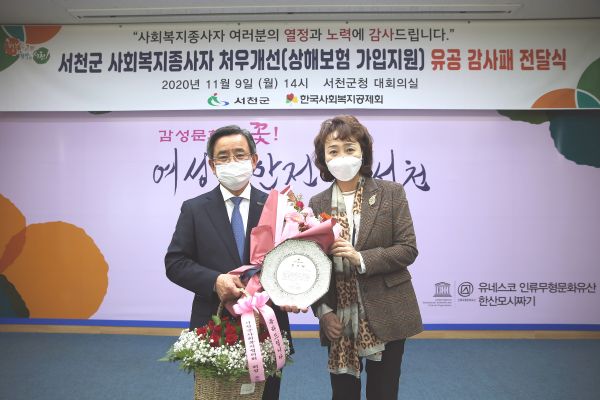 서천군청 회의실에서 열린 이날 수여식에는 강선경 한국사회복지공제회 이사장의 감사패 수여와 함께 지역 내 사회복지기관·단체가 참여한 가운데 사회복지 현안과 사업을 논의하는 시간을 가졌다.