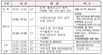 가족친화마을 주민과 관련 단체 및 기관에서 120명 정도가 모여 1년간의 필수공동프로그램 등 운영에 관한 나눔행사를 가진다.