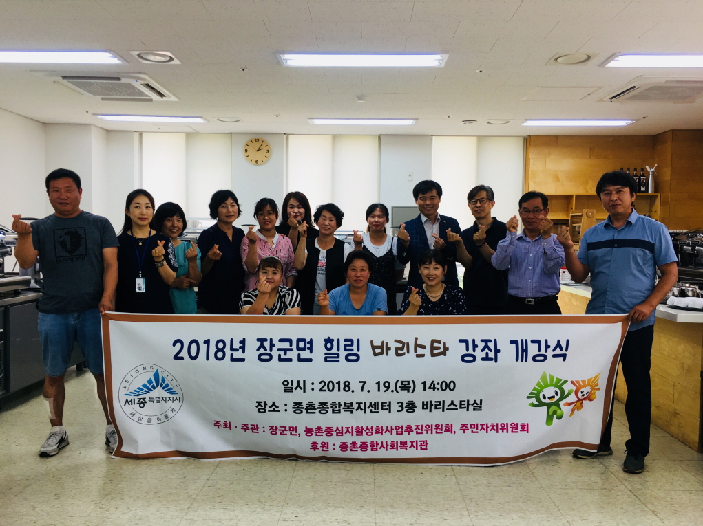 [충청뉴스큐]세종특별자치시 장군면 주민자치위원회와 농촌중심지활성화사업추진위원회는 종촌종합복지센터 종합사회복지관에 위탁하여 장군면민을 대상으로 바리스타 강좌를 개설, 지난 19일 종촌종합복지센터 3층 바리스타실에서 개강식을 가졌다.