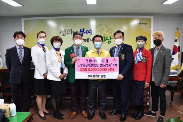 [충청뉴스큐] 부여 로타리클럽은 지난 11일 코로나19 극복을 기원하며 전기압력밥솥 10대, 전자레인지 10대를 부여군에 기탁했다.