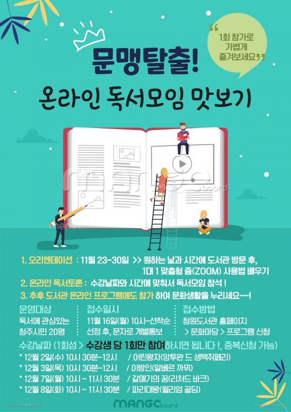 [충청뉴스큐] 청주청원도서관이 이달 23일부터 다음달 8일까지 ‘문맹탈출 온라인 독서토론 맛보기’특강을 운영한다.