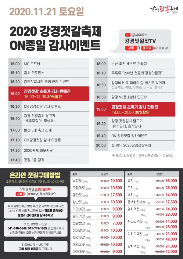 [충청뉴스큐] 지난 10월 전국 최초 실시간 방송 형식의 온라인 축제를 통해 130만 회의 조회수를 기록하며 전국적인 관심과 사랑을 받은 강경젓갈축제가 그 성원에 보답하기 위해 다시 찾아온다.