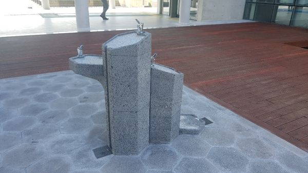 음수대는 제주지역에서는 염분이 많은 바람이 부는 만큼 해안바람으로 인해 도장이 벗겨지지 않도록 현무암을 이용한 디자인이 특색이다.