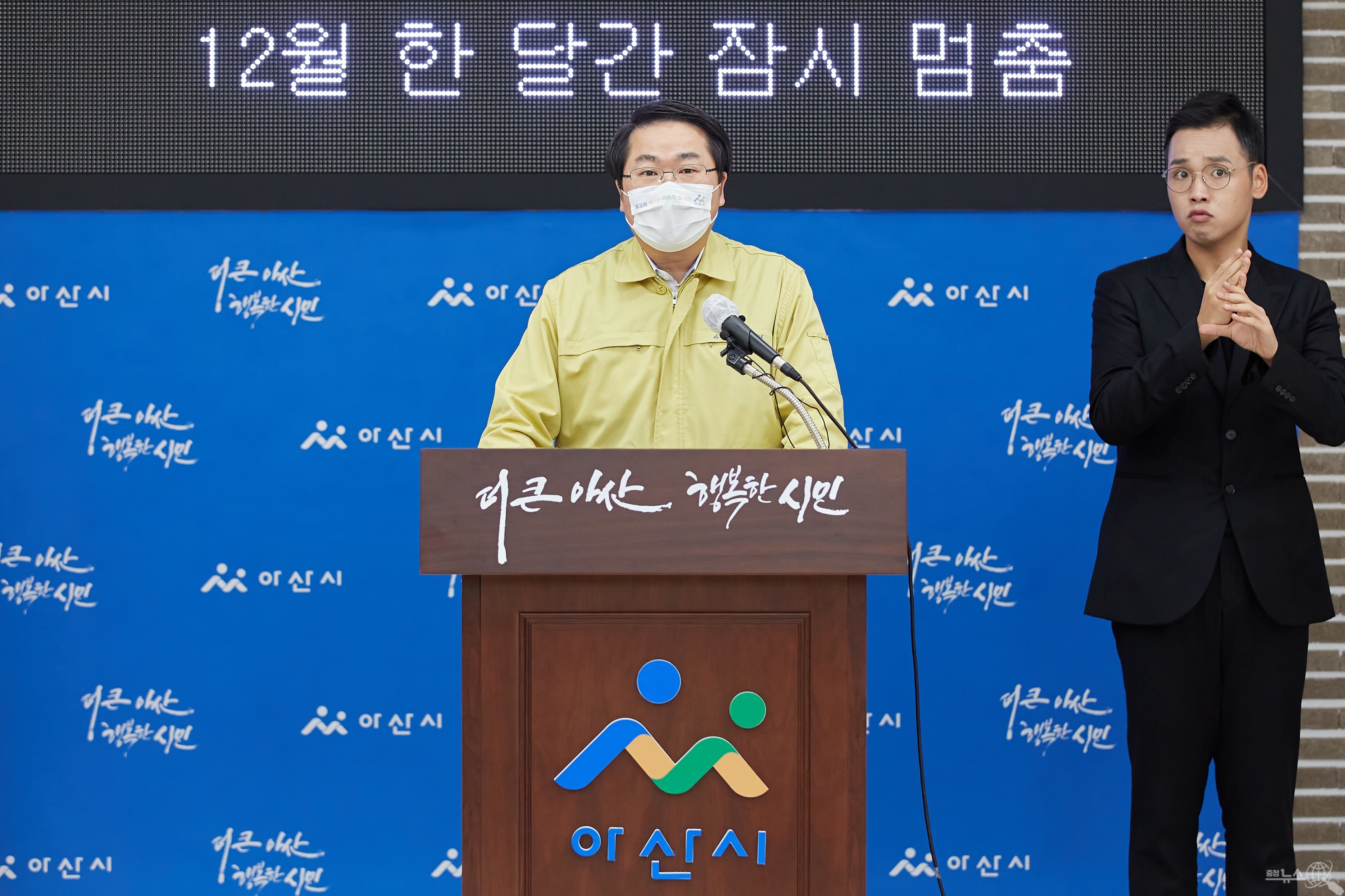 오세현 아산시장은 휴일날인 29일 오전 아산시청 브리핑룸에서 비대면 브리핑을 코로나19 방역조치 관련해 긴급하게 12월 한 달간 ‘일단 멈춤운동을’ 제안했다.