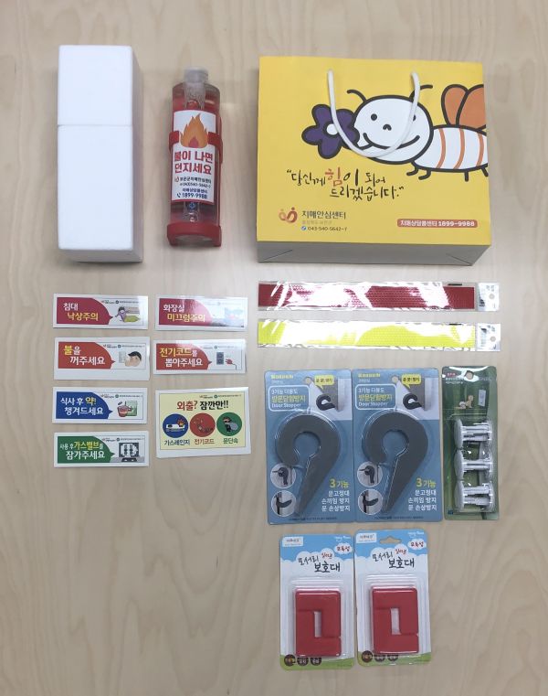주거안전키트는 방문 닫힘 방지, 모서리 보호대, 반사 스티커, 콘센트 안전커버, 투척용 소화기, 주거안전스티커가 1세트로 구성돼 있다.