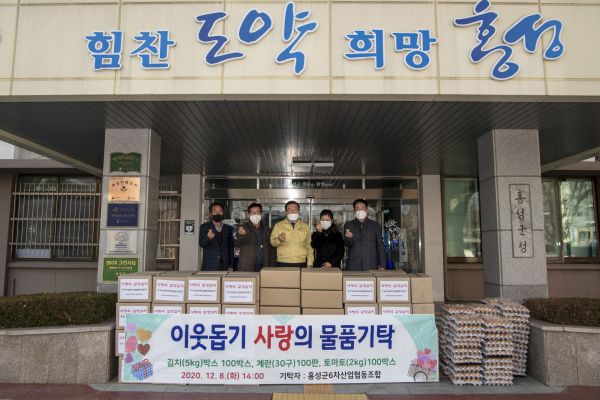 [충청뉴스큐] 홍성군6차산업협동조합은 지난 8일 어려운 이웃을 위해 김치 100박스, 군계란 100판, 토마토 100박스 등 500만원 상당의 물품을 홍성군에 기탁했다.