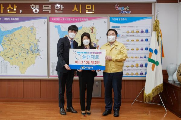 [충청뉴스큐] ㈜플랜제로가 지난 111일 아산시를 방문해 코로나19 예방 및 확산 방지를 위한 KF-94 마스크 10만장을 기부했다.