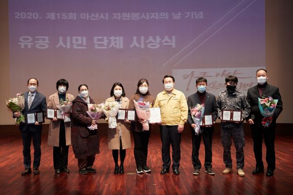 [충청뉴스큐] 아산시가 지난 14일 아산시청 시민홀에서 ‘2020년 아산시 자원봉사자의 날’ 기념 자원봉사 유공 시민 단체 시상식을 개최했다.